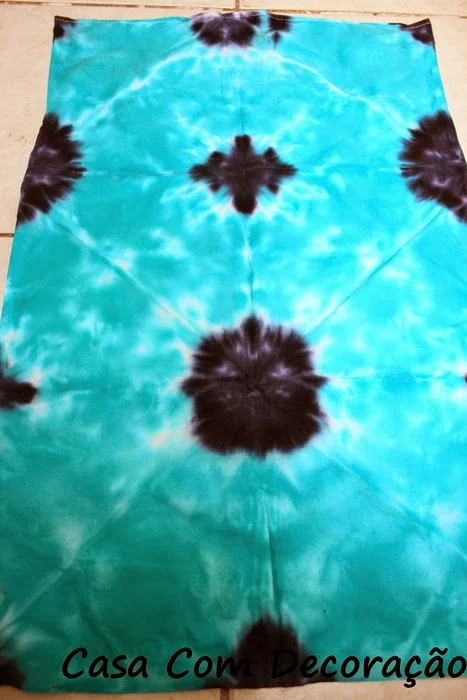 Depois coloquei a tinta nas pontas que foram amarradas, usando a cor Lótus mais diluída. Repeti o mesmo processo nos dois lados do tecido.