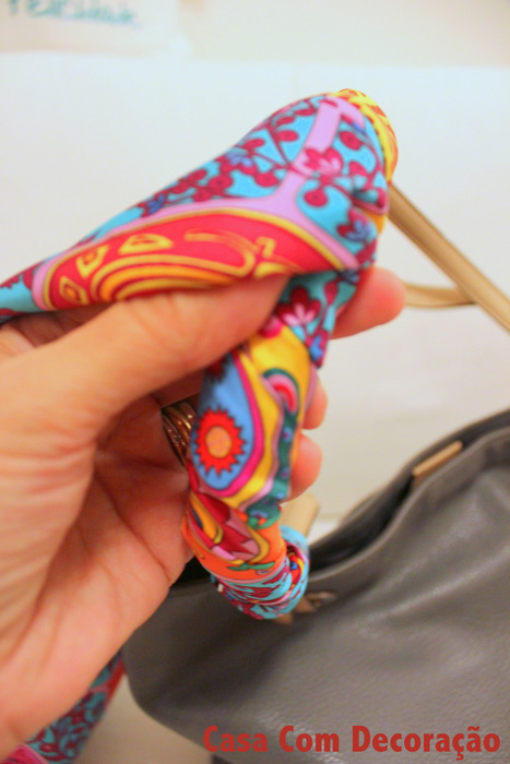 Hoje a ideia foi transformar uma bolsa com lenço colorido. O foulard é ótimo, porque tem o formato quadrado e é feito com tecido leve (seda).
